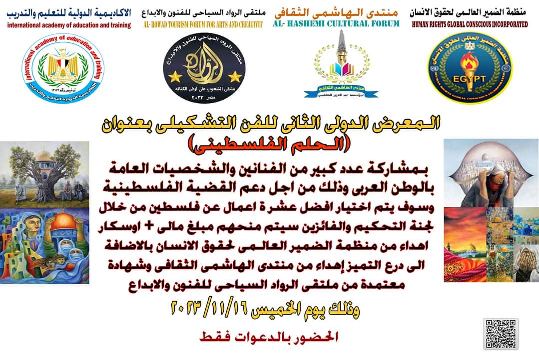 will be held. Under the patronage of Dr. Mina Youhanna, President of the Global Conscience Human Rights Organization, a visual art exhibition will be held to support the Palestinian cause, in cooperation with the International Academy for Education and Training and the Hashemite Cultural Forum.