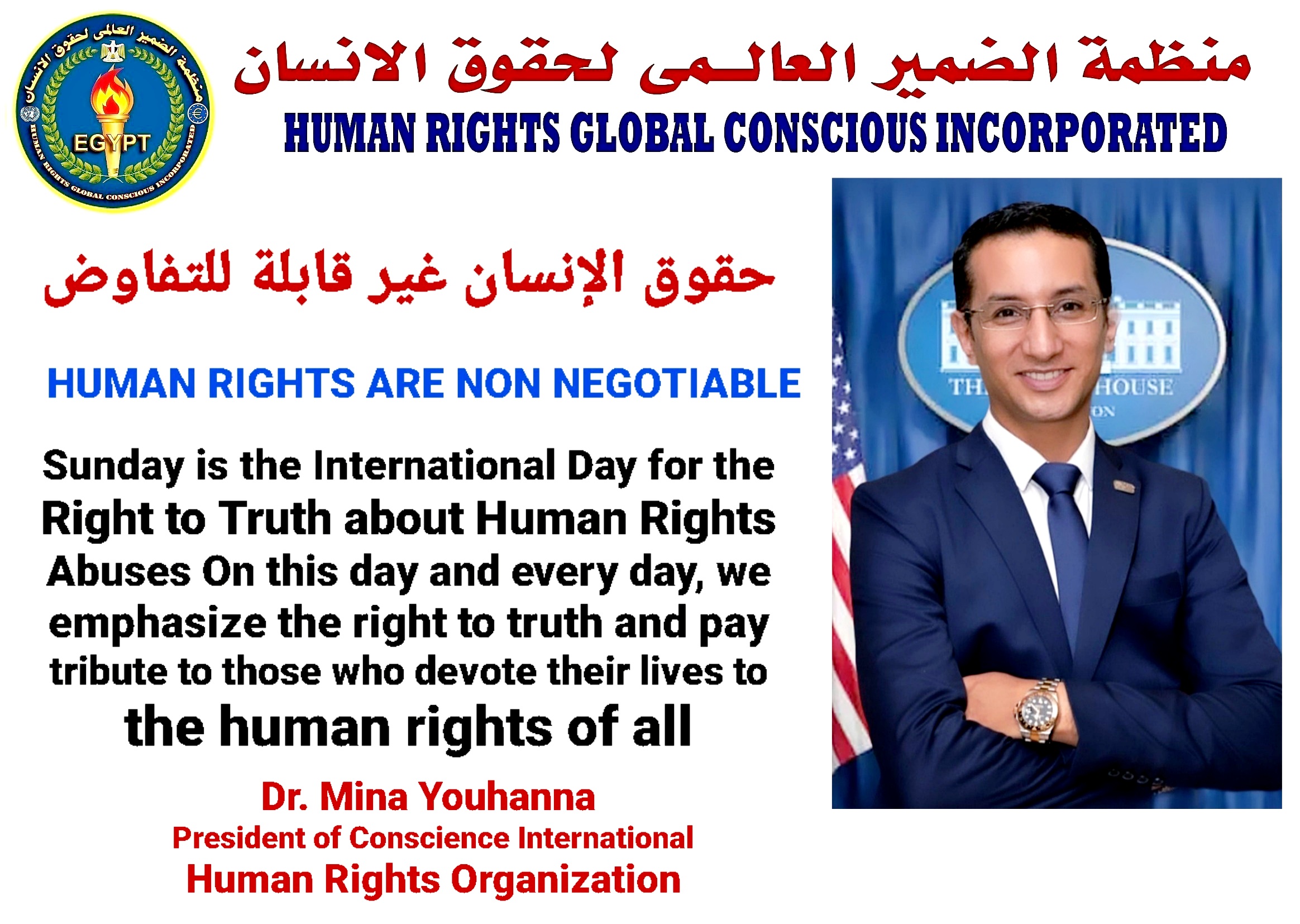 The United Nations-affiliated Global Conscience Human Rights Organization is an international organization established in 2009. It currently has three million members worldwide and branches in 121 countries, in addition to 27 branches in Egypt. The Global Conscience Human Rights Organization is guided in its mission and work by the goals and purposes contained in the International Covenant on Human Rights.