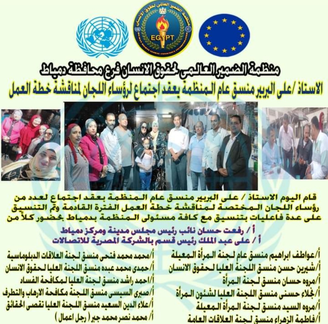 Under the auspices of Dr. Mina Youhanna Youssef, President of the Global Conscience Organization for Human Rights, legal advisor Ali Al-Barbir, the organization’s general coordinator in Damietta Governorate, held a meeting with several heads and coordinators of the branch’s specialized committees. The meeting discussed several different topics, most notably the organization’s upcoming activities and how to work to resolve citizens’ problems.