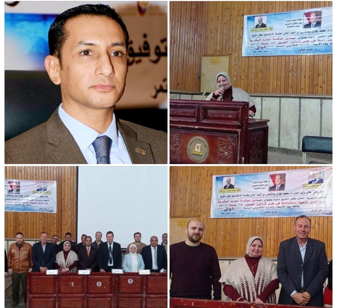 Under the auspices of Dr. Mina Youhanna, President of the Global Conscience Organization for Human Rights, Legal Advisor Azza Abdel Aziz, Director of the organization’s branch in Kafr El-Sheikh Governorate, responded to the kind invitation of the Undersecretary of the Ministry of Manpower, Dr. Hassan Heikal, and Mr. Ali Ghanem, Director of the Labor Office in Kafr El-Sheikh, in the presence of Dr. Ahmed Nasr, Dean of the Higher Institute in Kafr El-Sheikh, and Dr. Hoda El-Tanbari, Member of Parliament. The seminar was titled “Principles of Human Resources Governance for Sustainable Development under Labor Law No. 12 of 2003.” It discussed a cooperation protocol between the Global Conscience Organization for Human Rights and a number of institutions. Legal Advisor Azza Abdel Aziz explained the organization’s role and its cooperation with relevant authorities to enhance cooperation and build bridges of dialogue for the sake of humanity.